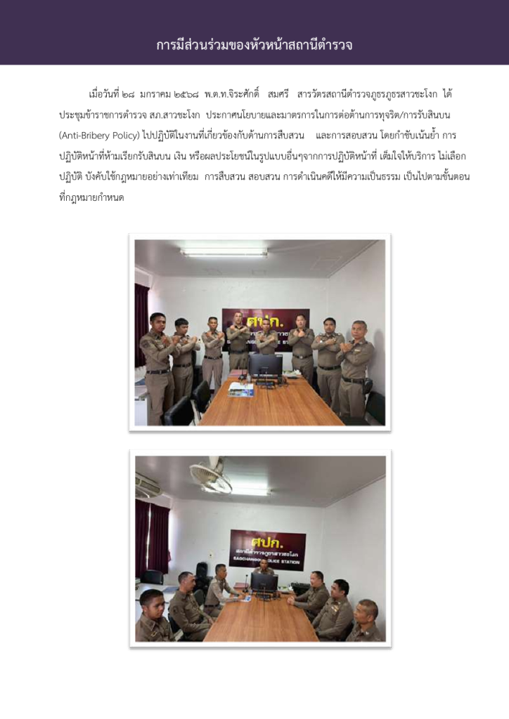 พ.ต.ท.จิระศักดิ์ สมศรี สารวัตรสถานีตำรวจภูธรภูธรสาวชะโงก ได้ประชุมข้าราชการต ารวจ สภ.สาวชะโงก ประกาศนโยบายและมาตรการในการต่อต้านการทุจริต/การรับสินบน(Anti-Bribery Policy) ไปปฏิบัติในงานที่เกี่ยวข้องกับด้านการสืบสวน และการสอบสวน