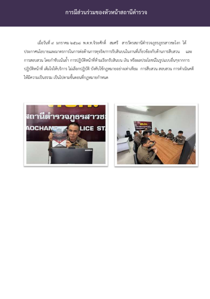 พ.ต.ท.จิระศักดิ์ สมศรี สารวัตรสถานีตำรวจภูธรภูธรสาวชะโงก ได้ประกาศนโยบายและมาตรการในการต่อต้านการทุจริต/การรับสินบนในงานที่เกี่ยวข้องกับด้านการสืบสวนและการสอบสวน