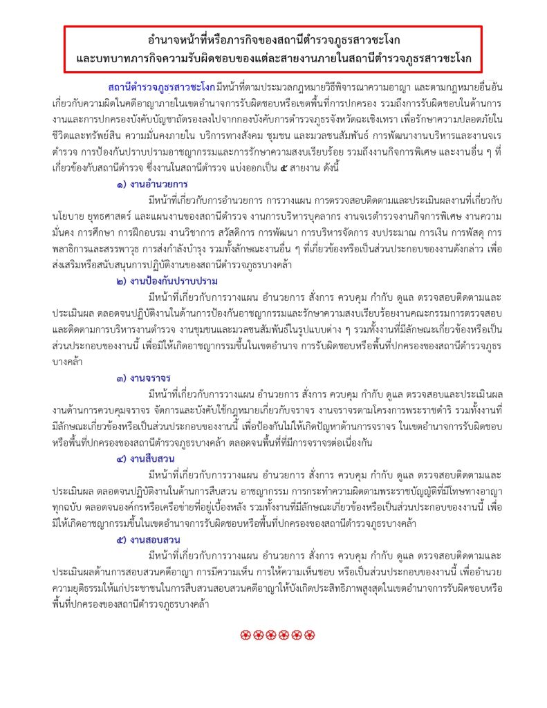 บทบาทภารกิจความรับผิดชอบของแต่ละสายงานภายในสถานีตำรวจภูธรสาวชะโงก